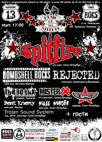 (ст.м. Чкаловская, наб. Адмирала Лазарева, д. 22) Фестиваль MUSIC OF THE STREETS Участвуют: SPITFIRE (ска-панк, Санкт-Петербург) BOMBSHELL ROCKS (панк-рок, Вестерос/Швеция) REJECTED (стритпанк, Лапеенранта/Финляндия) TURBO LAX (хардкор, Тольятти) MISTER X (стритпанк, Гродно/Беларусь) ENGAGE AT WILL (хардкор, Санкт-Петербург) BEST ENEMY (панк-рок, Москва) MASS MURDER (панк-рок, Санкт-Петербург) + ожидаются гости Фестиваль начнется с диджейского сета от TROJAN SOUND SYSTEM в стиле ска и регги. Билеты в предварительной продаже по 450 рублей, на входе по 500 рублей. До 20 сентября билеты по 350 рублей. Начало фестиваля в 17:00. Справки по телефону: 8 (812) 931-76-79 Генеральные информационные спонсоры фестиваля - телеканал "A1" и "Радио Рокс".